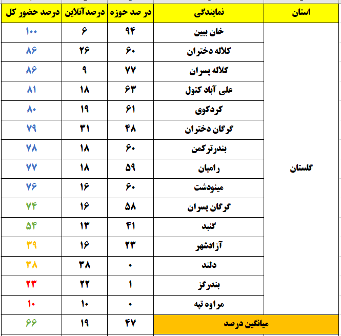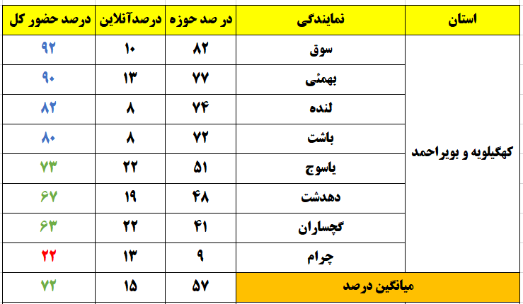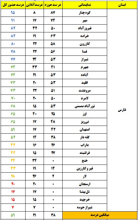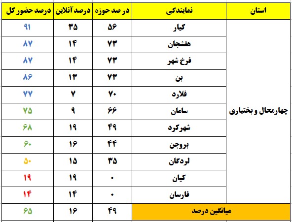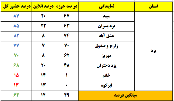 رنگ زرد : درصد حضور بین 26 تا 50 ، تعداد نمایندگی : 41شهر