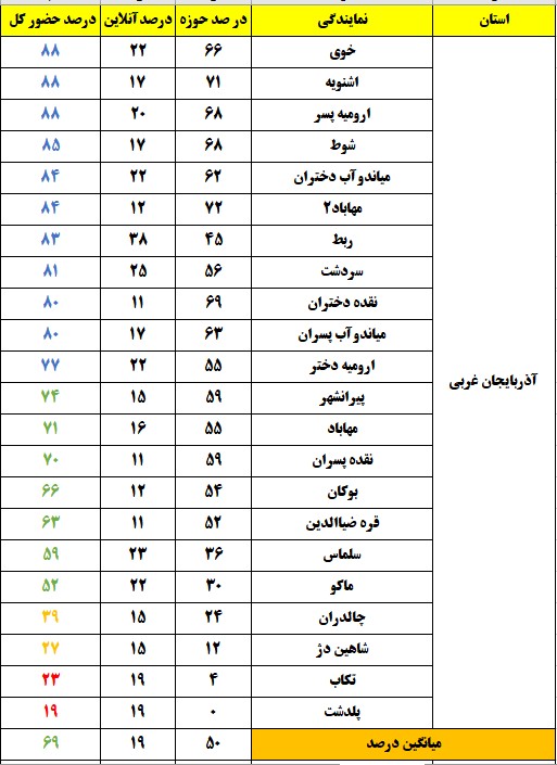 رنگ سبز : درصد بین 51 تا 75 ، تعداد نمایندگی : 144 شهر