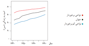 • شاخص امید به زندگی در نواحی برخوردار بیشتر از نواحی کم برخوردار و شیب منحنی برای نواحی کم برخوردار بیشتر از میانگین جهانی و آن نیز بیشتر از مناطق برخوردار است همچنین شاخص امید به زندگی در حال حاضر به طور میانگین 65 سال است .
