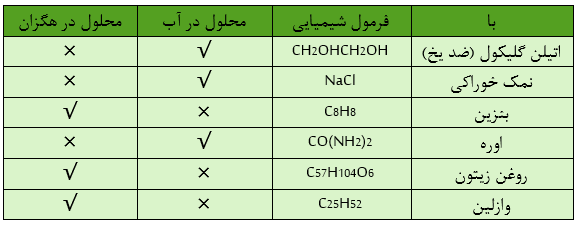 • در فرایند انحلال، اگر ذره های سازنده حل شونده با مولکول های حلال جاذبه های مناسب برقرار کنند، حل شونده در حلال حل میشود در غیر این صورت ذره های حل شونده کنار هم باقی می مانند و در حلال پخش نمی شوند. هنگامی که عسل وارد آب می شود، مولکول های سازنده آن با مولکول های آب پیوند هیدروژنی برقرار می کنند و در سرتاسر آن پخش می شوند.