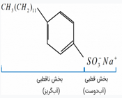 • هنگامی که صابون وارد آب میشود، به کمک سر آب دوست خود در آن حل میشود. از سوی دیگر، ذره های صابون با بخش چربی دوست خود با مولکول های چربی جاذبه برقرار میکنند، گویی مولکول های صابون مانند پلی بین مولکول های آب و چربی قرار میگیرند. به این ترتیب، ذره های چربی کم کم از سطح پارچه جدا و در آب پخش میشوند. با ادامه این فرایند، همه لکه های چربی از روی لباس پاک میشود.