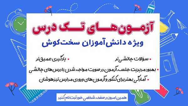 همچنین با توجه به تجربه موفق سال گذشته این آزمون ها و استقبال خیلی خوب حتی دانش آموازن پایه های دهم و یازدهم امسال نیز قصد داریم با آزمون های تک درس که شامل سوالات چالشی و تا حدودی دشوار می باشد به دانش آموزان در این مهم کمک کنیم.