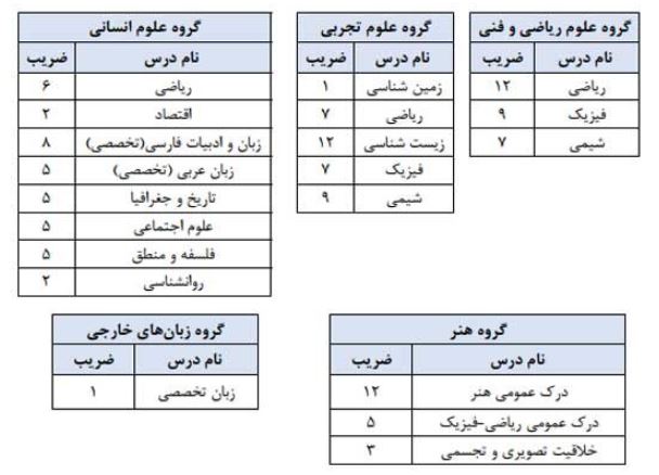 | ریاضی فیزیک | علوم تجربی | ادبیات و علوم انسانی | علوم و معارف اسلامی | سایر* | ضریب | امتحانات برای ایجاد سابقه تحصیلی | ||