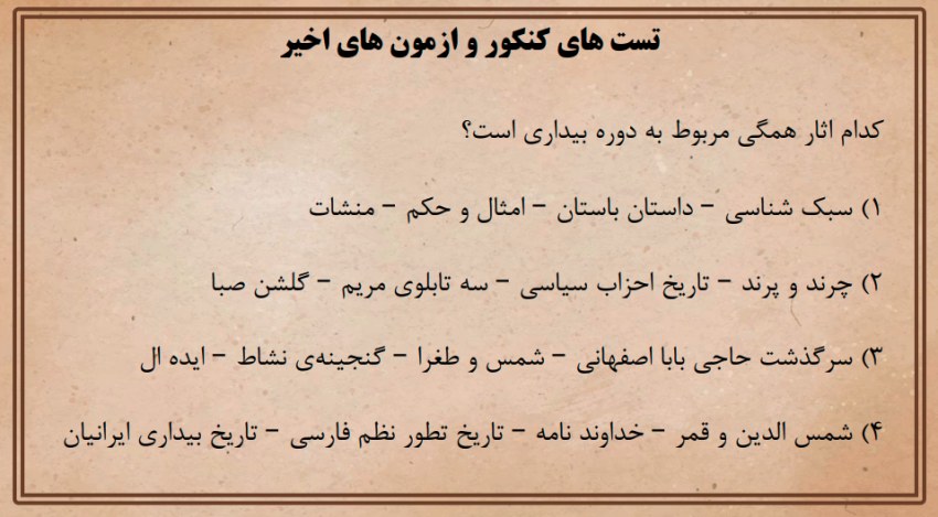 در این مطلب به بررسی دقیق درس یک علوم و فنون ادبی سه ، تاریخ ادبیات قرن دوازدهم و سیزدهم به همراه حل سوالات کنکور و ازمون سالیان اخیر از این درس میپردازیم.
