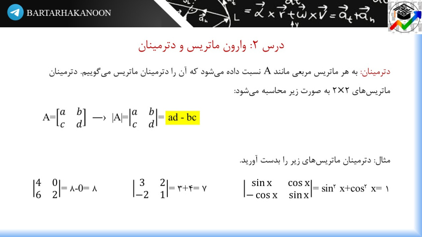 این مطلب دارای درسنامه درس 2 فصل اول هندسه دوازدهم، یعنی ماتریس وارون و دترمینان است که با نکتهها و مثالهای تشریحی، به شما در یادگیری مطلب کمک میکند.