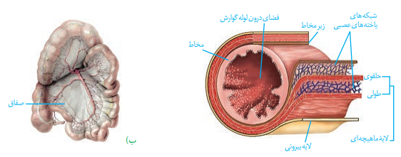 اندازۀ چینخوردگیهای روده باریک هماندازه نیستند. به تراکم رگهای خونی دقت کنید. روده کور از بقیۀ قسمتهای روده بزرگ قطورتر است. همه لایه ها دارای مویرگ خونی هستند.