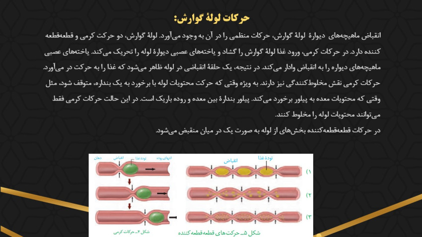 حرکات روده باریک: بصورت کرمی و قطعهقطعه است که علاوه بر پیش بردن کیموس آن را برای مخلوط شدن با شیره گوارشی میگستراند.