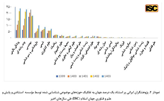 نمودار ۲، فراوانی پژوهشگران ایرانی پر استناد یک درصد جهان به تفکیک حوزه های موضوعی شناسایی شده توسط مؤسسه استنادی و پایش علم و فناوری جهان اسلام (ISC) طی سال های اخیر را نشان می دهد.
