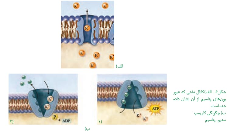 شکل 6 – الف نشون دهنده کانال نشتی هست. کانال نشتی یکی از پروتئین های موثر در جا به جایی یون هاست. یون ها از طریق انتشار تسهیل شده از آن عبور می کنن. طبق قانون انتشار تسهیل شده که در جهت شیب غلظت می باشد، یون های پتاسیم از یاخته خارج و یون های سدیم به یاخته وارد میشن. کانال نشتی از نوع پروتئین های سراسری منفذ دار می باشد که با انتشار تسهیل شده فعالیت می کند.