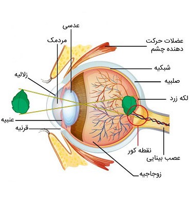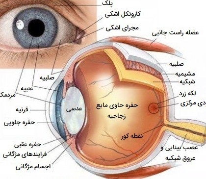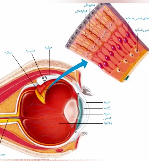 گیرنده های عصبی چشم: در لایه داخلی چشم یعنی شبکیه دو نوع سلول (باخته) گیرنده نوری مخروطی و استوانه ای هست. | ![]() |