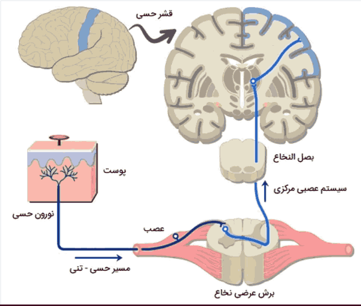 حس لامسه : در لایه میانی پوست گیرنده های مختلفی وجود دارند که نسبت به گرما، سرما، فشار درد و لمس حساس هستند. تحریک هر کدام از این گیرنده ها پیام عصبی خاصی ایجاد می کند که این پیام به قشر مخ فرستاده می شود.