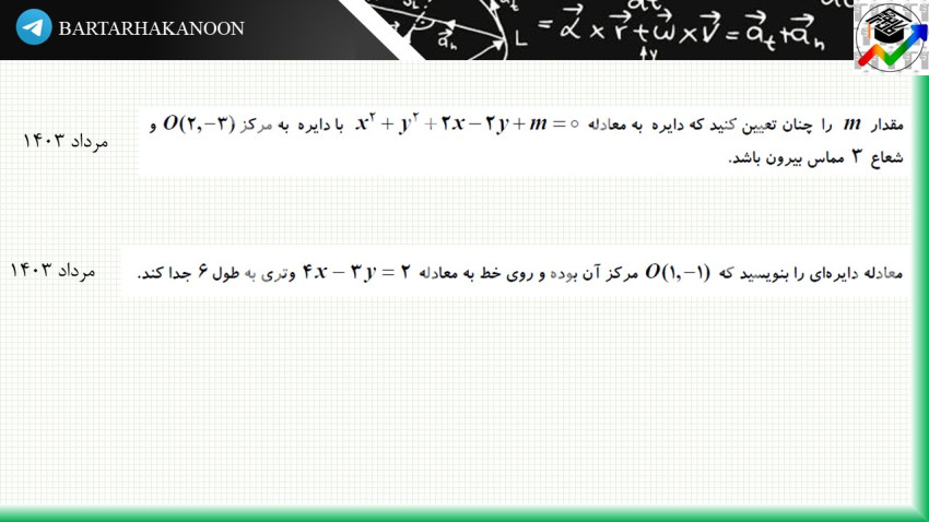 مثال: معادله دایره به مرکز O(1,2) و گذرنده از نقطه A(2,-1) را بیابید.