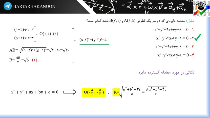 معادله دایره: (x-1)^2 + (y-2)^2 = 10