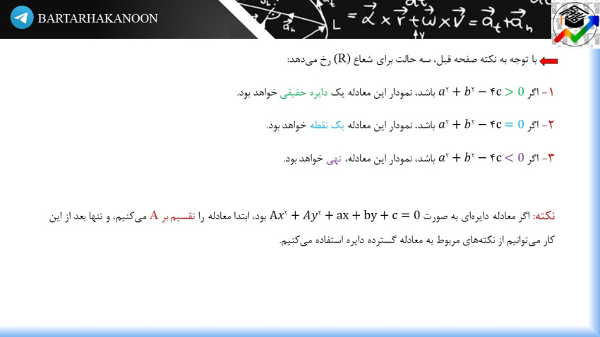 نکته: معادله دایرهای به مرکز مبدا مختصات O(0,0) به صورت x^2 + y^2 = R^2 میباشد.