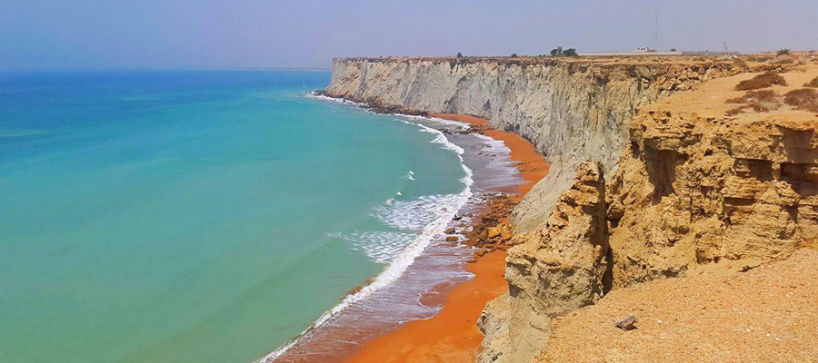 قسمت هایی که جنس سنگ های ساحلی در برابر فرسایش مقاوم هستند، شکل ساحل به صورت صخره ای ویرتگاهی است. (سواحل چابهار)