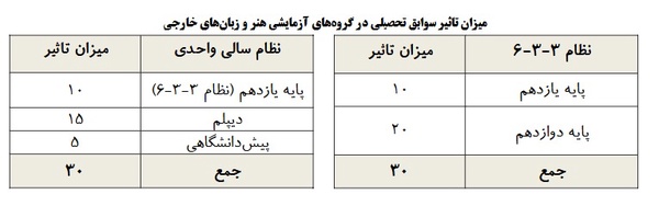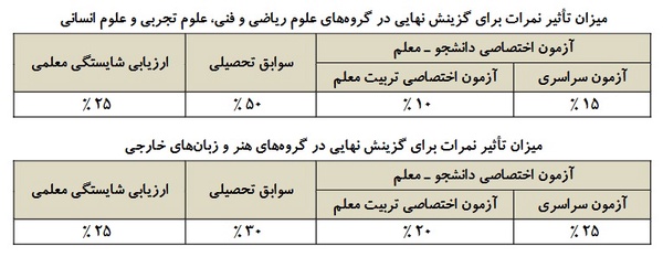 به گزارش خبرنگار گروه دانشگاه خبرگزاری فارس، ثبتنام برای شرکت داوطلبان در نوبت اول آزمون سراسری و آزمون اختصاصی پذیرش دانشجو_معلم از روز گذشته از طریق سایت سازمان سنجش آموزش کشور آغاز شده و تا اول دی ماه ادامه دارد.نوبت اول آزمون سراسری و آزمون اختصاصی پذیرش دانشجو_معلم در اردیبهشت ماه برگزار میشود.تأثیر سوابق تحصیلی در آزمون اختصاصی دانشجو_معلم نیز براساس تصاویر زیر است: