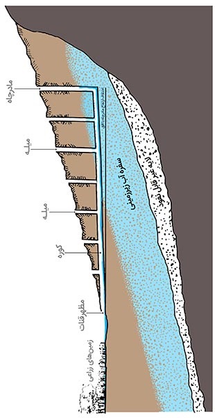 قنات (کاریز): قنات یک کانال افقی است که در زمین های شیب دار حفر می شود تا جایی که به آب های زیر زمینی راه یابد. این کانال در طول مسیر خود توسط چاه هایی به سطح زمین راه دارد. | ![]() |