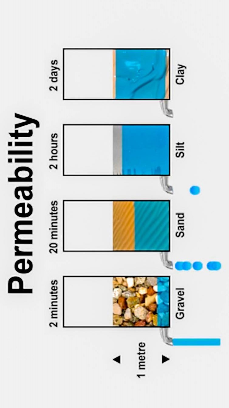 نفوذ پذیری: توانایی خاک برای عبور آب را نفوذ پذیری می گویند. نکته: هر چه مواد تشکیل دهنده خاک ریزتر باشند نفوذ پذیری آنها کمتر است مانند خاک رس
