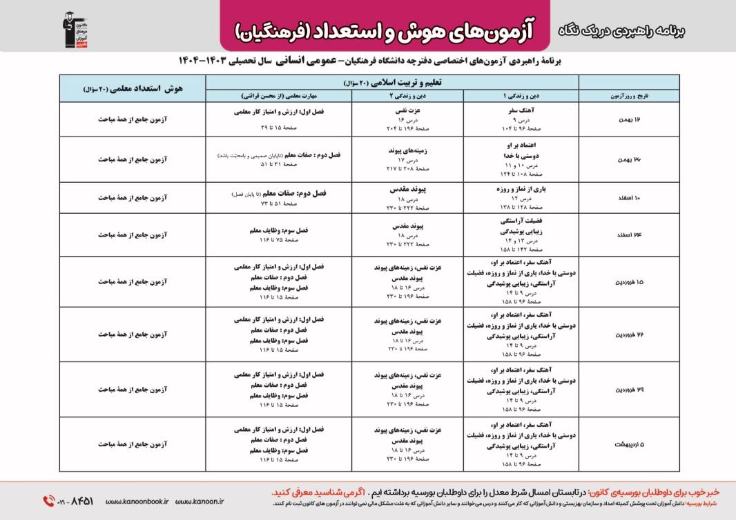 کانون فرهنگی آموزش، در سال تحصیلی ۱۴۰۳ ـ۱۴۰۴، همچون سال گذشته، برنامهای ویژهی داوطلبان کنکور فرهنگیان در نظر گرفت. با توجّه به اعلام رسمی منابع کنکور اردیبهشتماه ۱۴۰۴، منابع تعلیم و تربیت اسلامی نیز به دفترچهها افزوده و در تاریخهای زیر، هشت آزمون در اختیار مخاطبان قرار داده میشود. توجّه بفرمایید که با توجّه به تفاوت منابع تعلیم و تربیت اسلامی در رشتهی انسانی، برنامه و دفترچهی این گروه با دیگر گروهها متفاوت خواهد بود.
