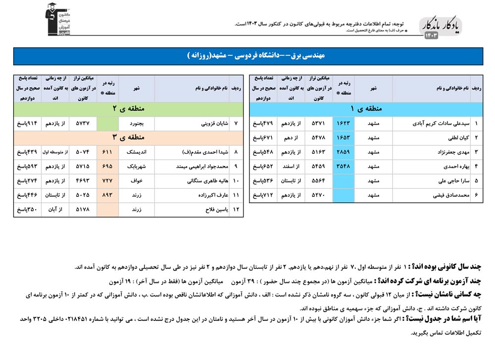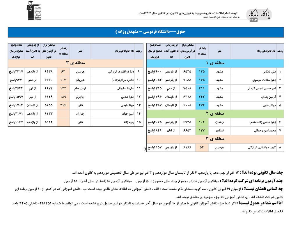 یادگار ماندگار : قبولی های کانونی دانشگاه فردوسی مشهد در همه رشته ها در سال 1403 را در ادامه مشاهده کنید.فایل با کیفیت قبولی های سال 1403 را در قسمت فایل های ضمیمه دانلود کنید.