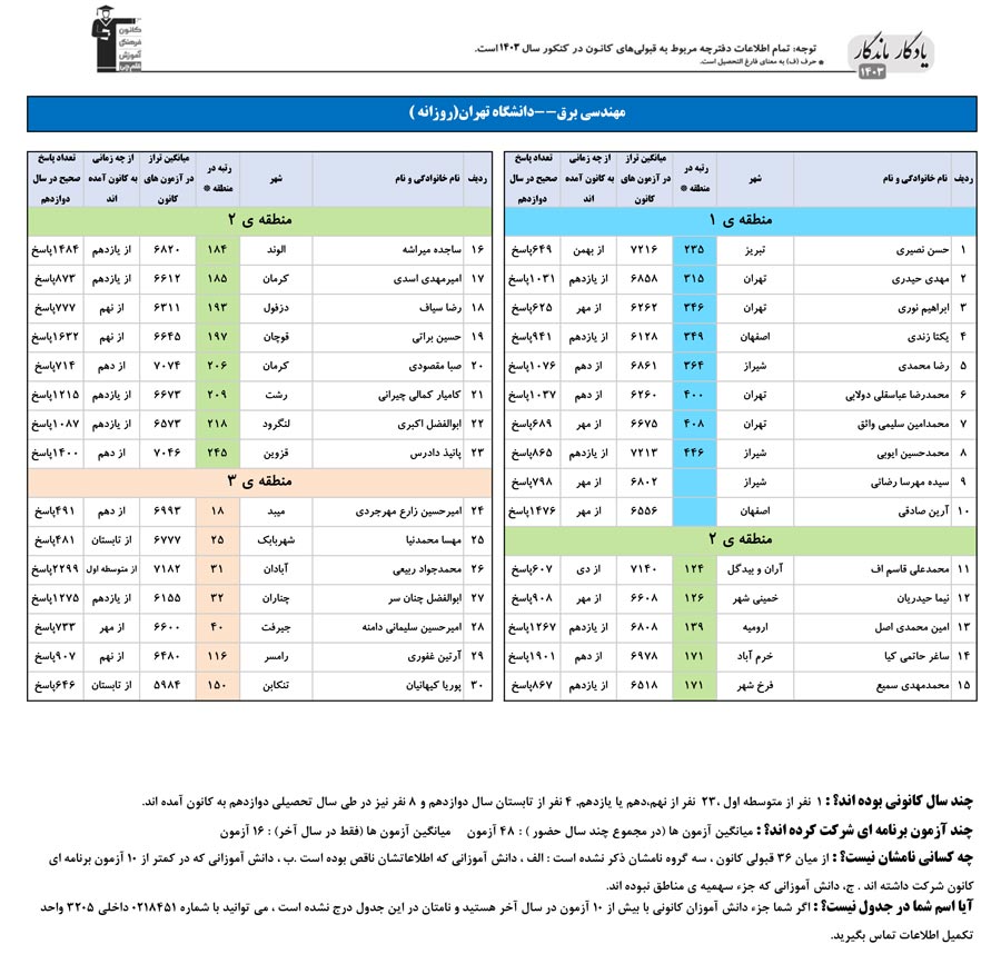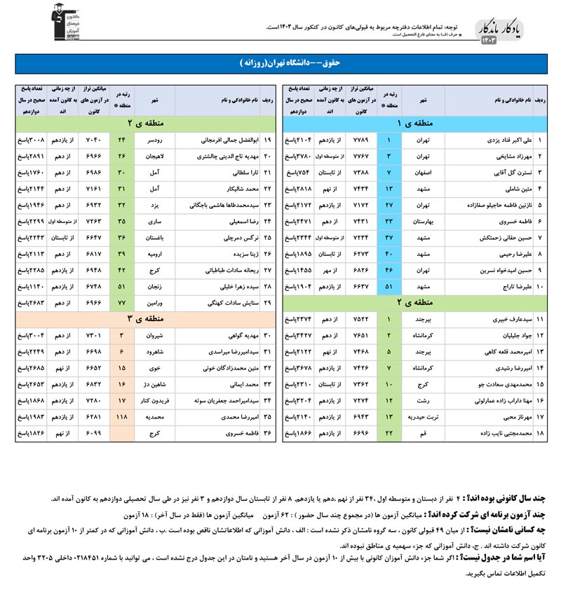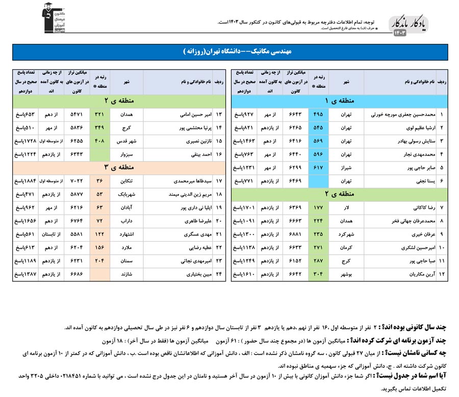 یادگار ماندگار : قبولی های کانونی دانشگاه تهران در همه رشته ها در سال 1403 را در ادامه مشاهده کنید.فایل با کیفیت قبولی های سال 1403 را در قسمت فایل های ضمیمه دانلود کنید.