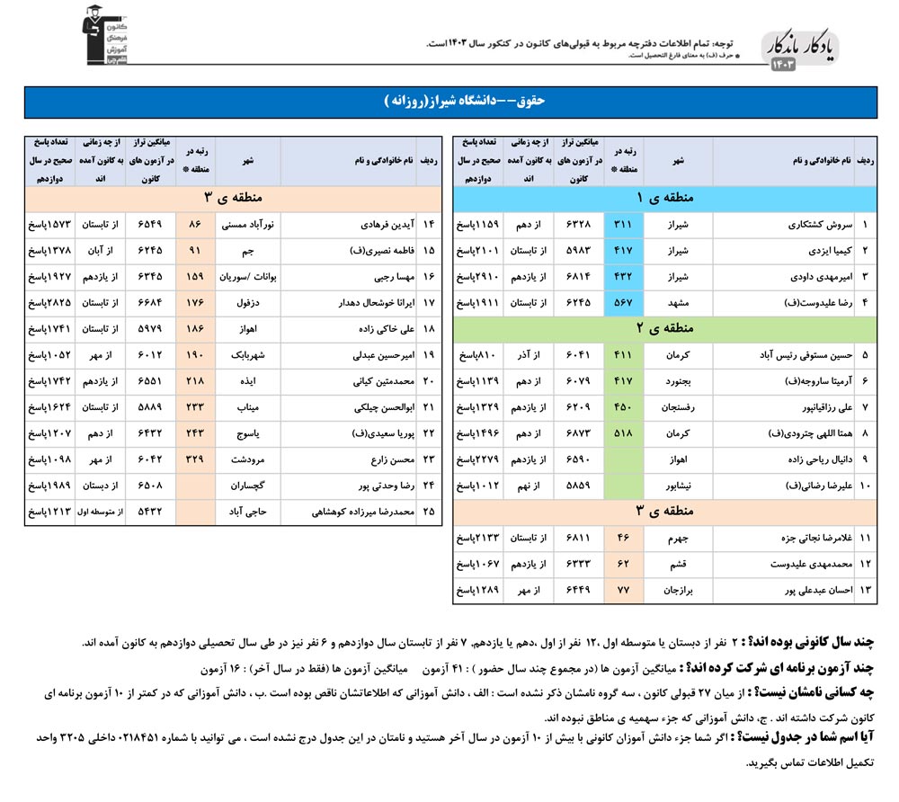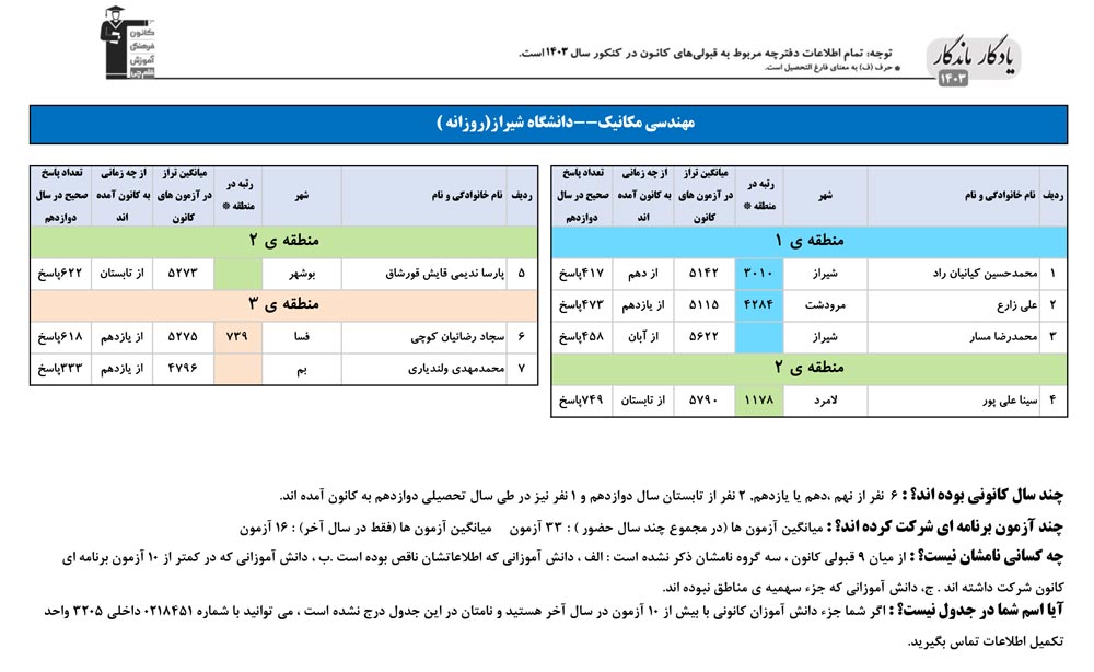 یادگار ماندگار : قبولی های کانونی دانشگاه شیراز را در همه رشته ها در سال 1403 را در ادامه مشاهده کنید.فایل با کیفیت قبولی های سال 1403 را در قسمت فایل های ضمیمه دانلود کنید.