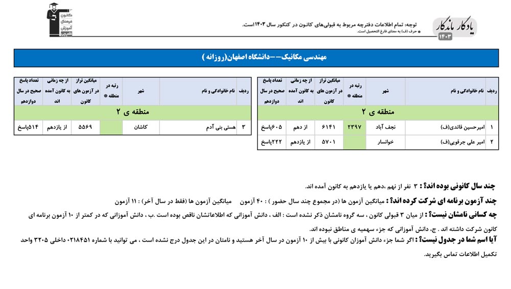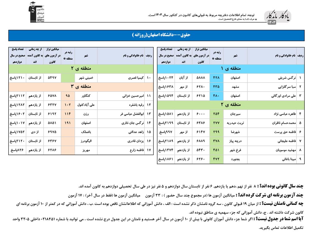 یادگار ماندگار : قبولی های کانونی دانشگاه اصفهان در همه رشته ها در سال 1403 را در ادامه مشاهده کنید.فایل با کیفیت قبولی های سال 1403 را در قسمت فایل های ضمیمه دانلود کنید.