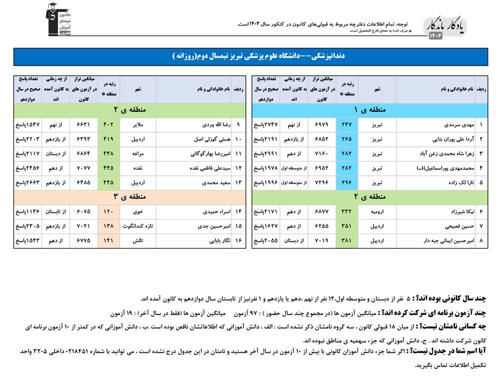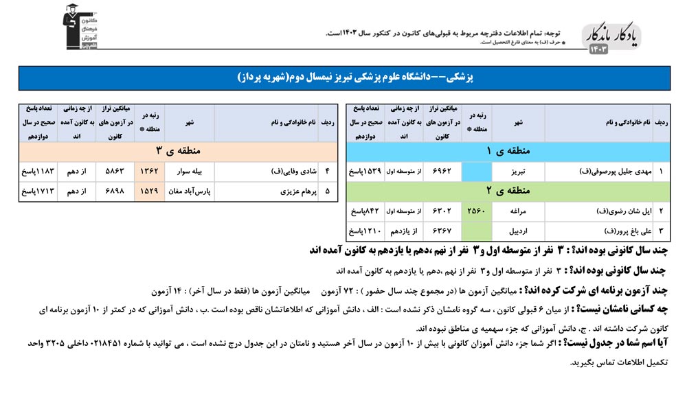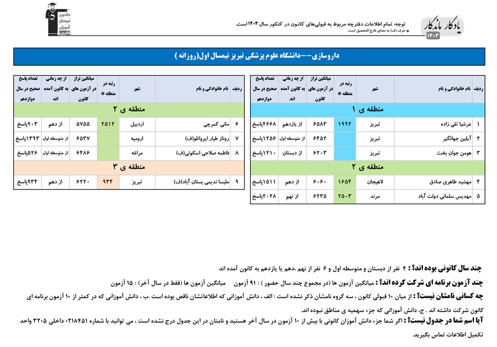یادگار ماندگار : قبولی های کانونی دانشگاه علوم پزشکی تبریز در همه رشته ها در سال 1403 را در ادامه مشاهده کنید.فایل با کیفیت قبولی های سال 1403 را در قسمت فایل های ضمیمه دانلود کنید.