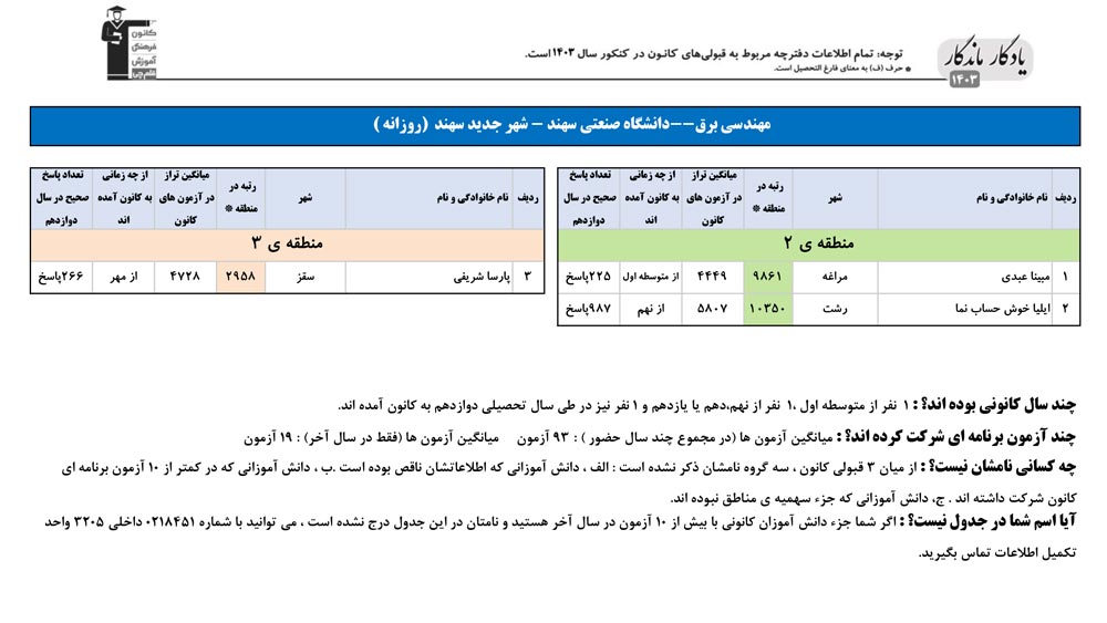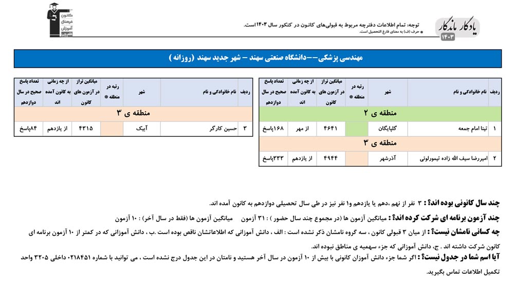 یادگار ماندگار : قبولی های کانونی دانشگاه صنعتي سهند شهرجدید سهند در همه رشته ها در سال 1403 را در ادامه مشاهده کنید.فایل با کیفیت قبولی های سال 1403 را در قسمت فایل های ضمیمه دانلود کنید.