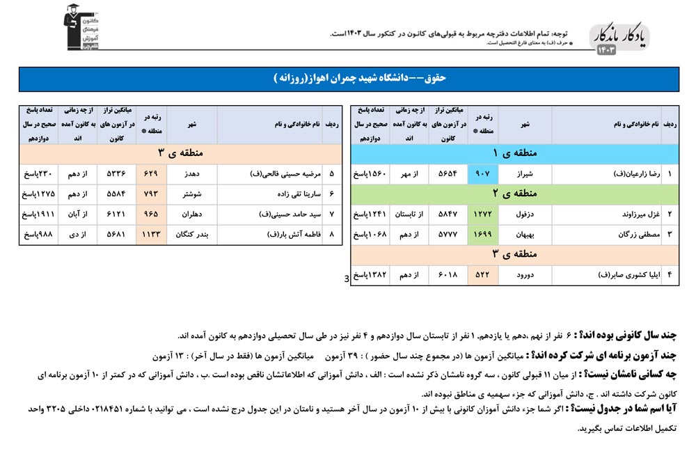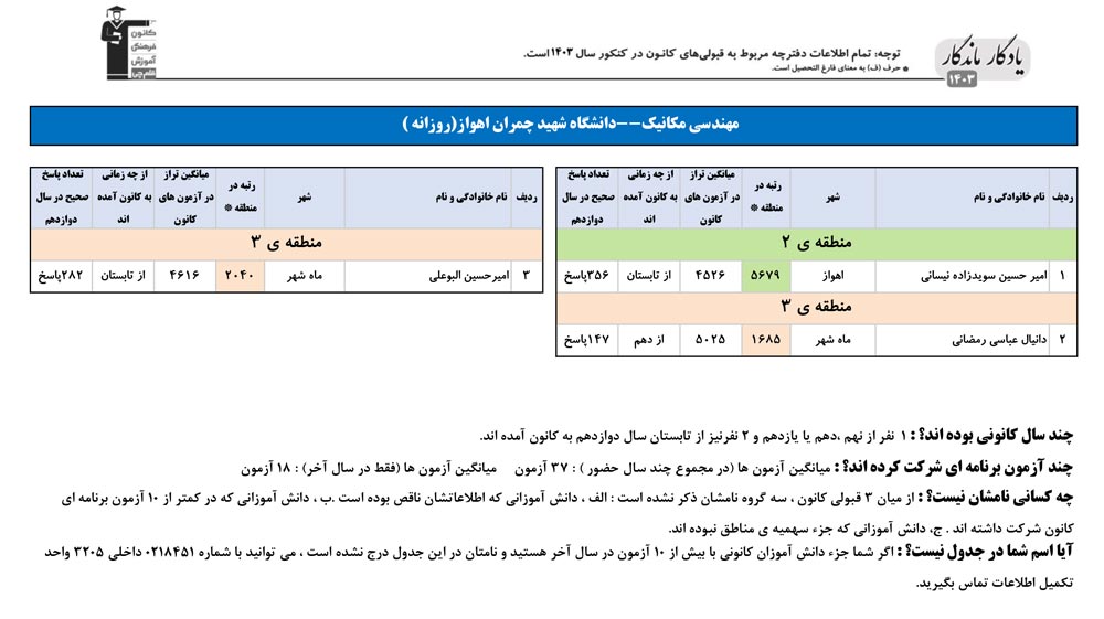 یادگار ماندگار : قبولی های کانونی دانشگاه شهيد چمران اهواز در همه رشته ها در سال 1403 را در ادامه مشاهده کنید.فایل با کیفیت قبولی های سال 1403 را در قسمت فایل های ضمیمه دانلود کنید.