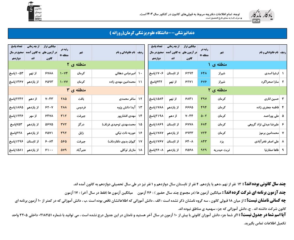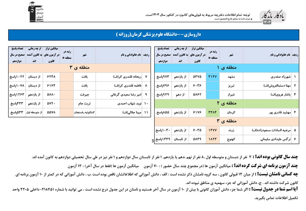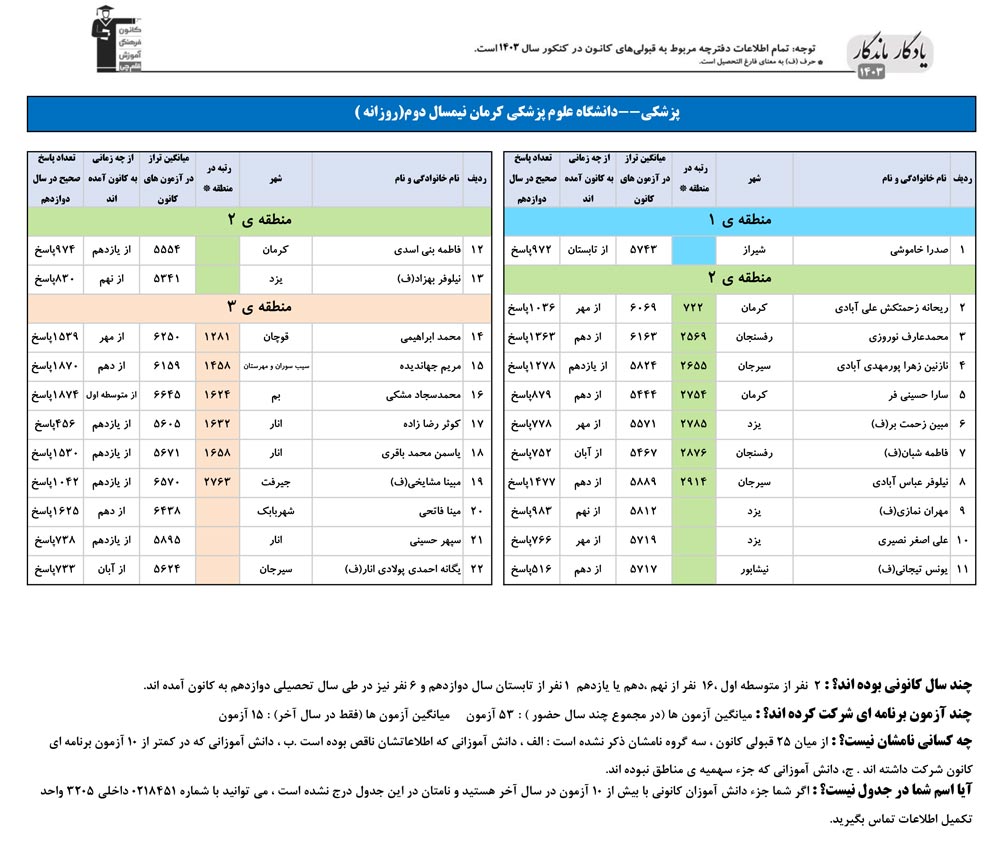 یادگار ماندگار : قبولی های کانونی دانشگاه علوم پزشکی کرمان در همه رشته ها در سال 1403 را در ادامه مشاهده کنید.فایل با کیفیت قبولی های سال 1403 را در قسمت فایل های ضمیمه دانلود کنید.