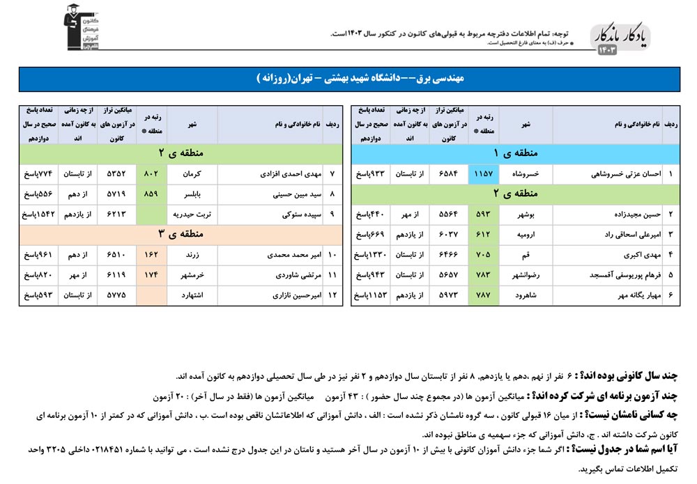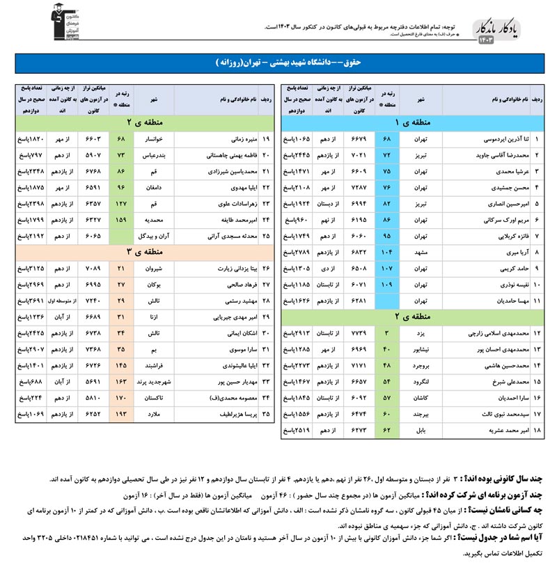 یادگار ماندگار : قبولی های کانونی دانشگاه شهید بهشتی تهران در همه رشته ها در سال 1403 را در ادامه مشاهده کنید.فایل با کیفیت قبولی های سال 1403 را در قسمت فایل های ضمیمه دانلود کنید.