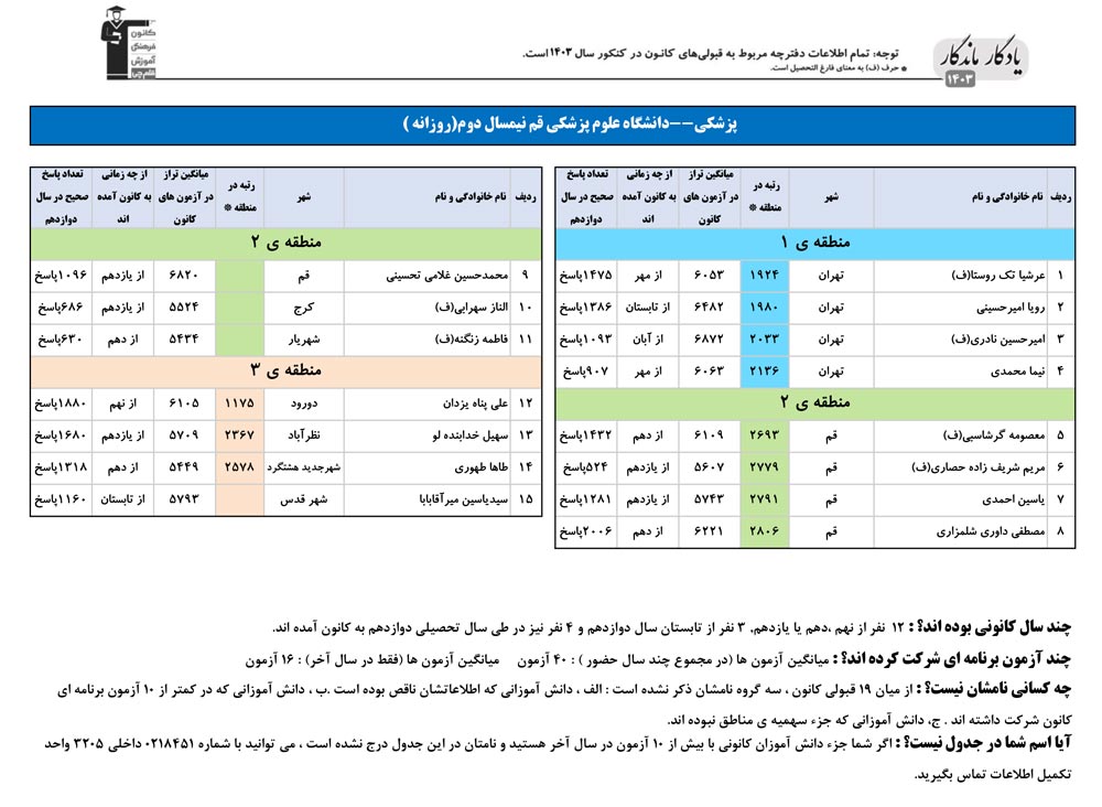 یادگار ماندگار : قبولی های کانونی دانشگاه علوم پزشکی قم در همه رشته ها در سال 1403 را در ادامه مشاهده کنید.فایل با کیفیت قبولی های سال 1403 را در قسمت فایل های ضمیمه دانلود کنید.