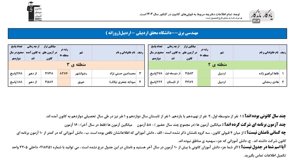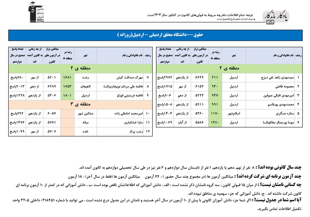 یادگار ماندگار : قبولی های کانونی دانشگاه محقق اردبيلي اردبيل در همه رشته ها در سال 1403 را در ادامه مشاهده کنید.فایل با کیفیت قبولی های سال 1403 را در قسمت فایل های ضمیمه دانلود کنید.