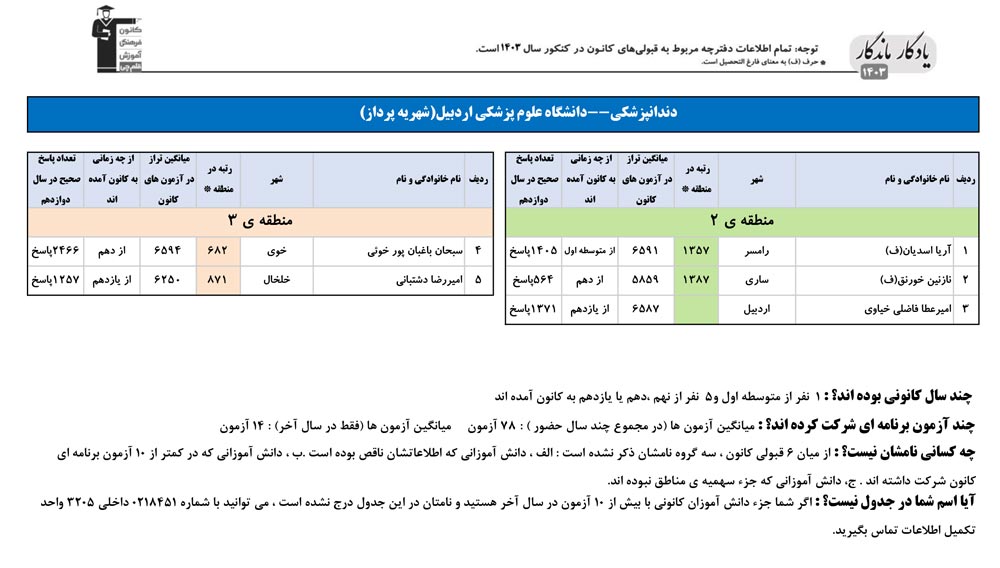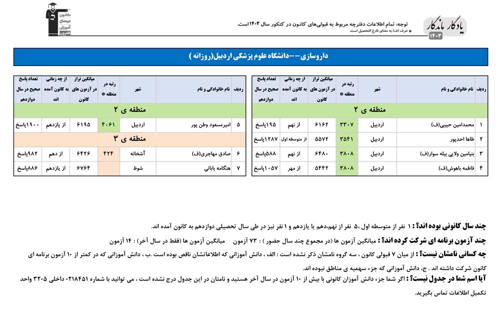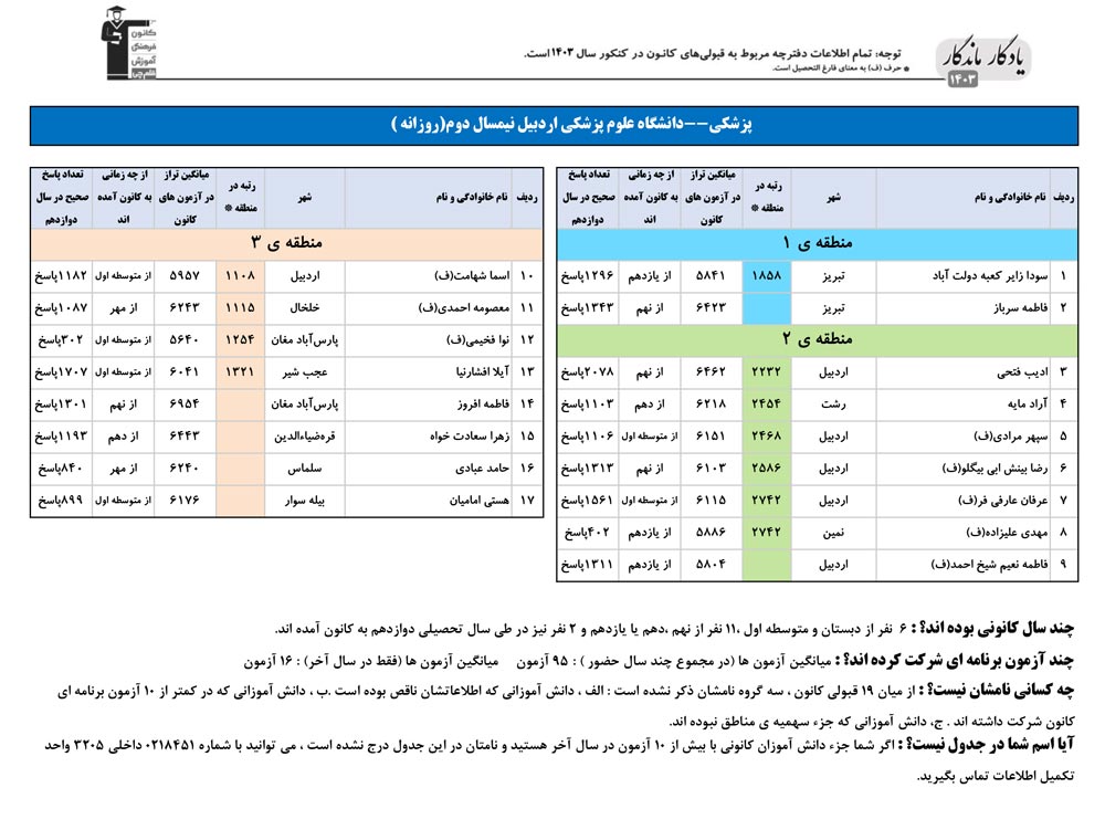 یادگار ماندگار : قبولی های کانونی دانشگاه علوم پزشکی اردبیل در همه رشته ها در سال 1403 را در ادامه مشاهده کنید.فایل با کیفیت قبولی های سال 1403 را در قسمت فایل های ضمیمه دانلود کنید.