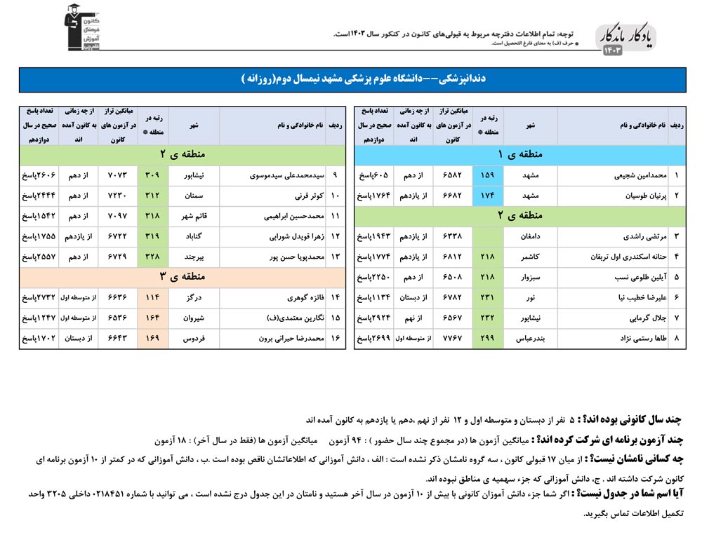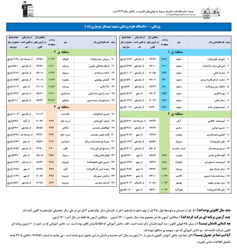 یادگار ماندگار : قبولی های کانونی دانشگاه علوم پزشکی مشهد در همه رشته ها در سال 1403 را در ادامه مشاهده کنید.فایل با کیفیت قبولی های سال 1403 را در قسمت فایل های ضمیمه دانلود کنید.
