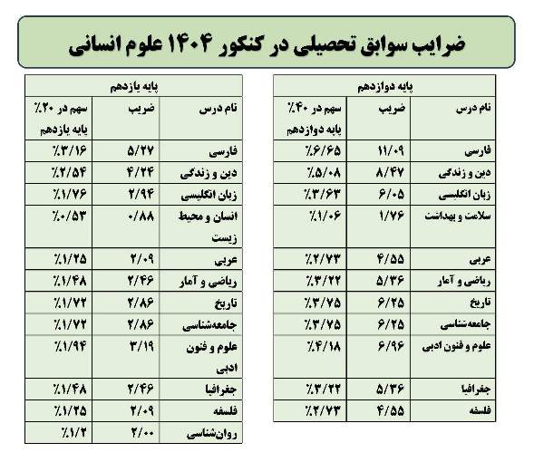 در این مطلب شما میتوانید ضریب و تاثیر هر درس اختصاصی و عمومی دوازدهم و یازدهم را در نتیجه ورودی به دانشگاه در سال ۱۴۰۴ مشاهده کنید.