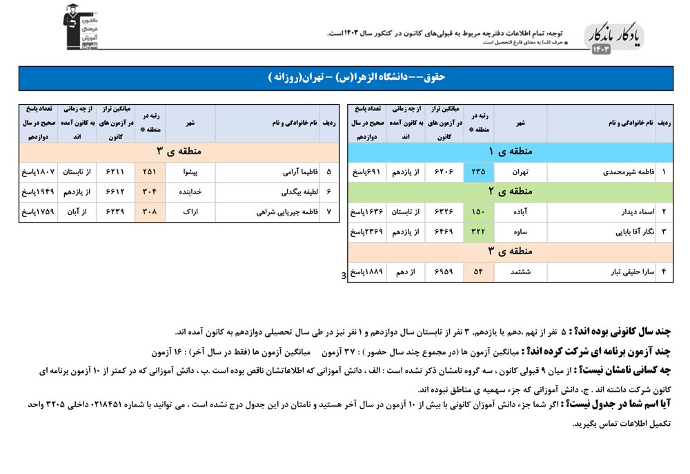 یادگار ماندگار : قبولی های کانونی دانشگاه الزهرا در همه رشته ها در سال 1403 را در ادامه مشاهده کنید.فایل با کیفیت قبولی های سال 1403 را در قسمت فایل های ضمیمه دانلود کنید.