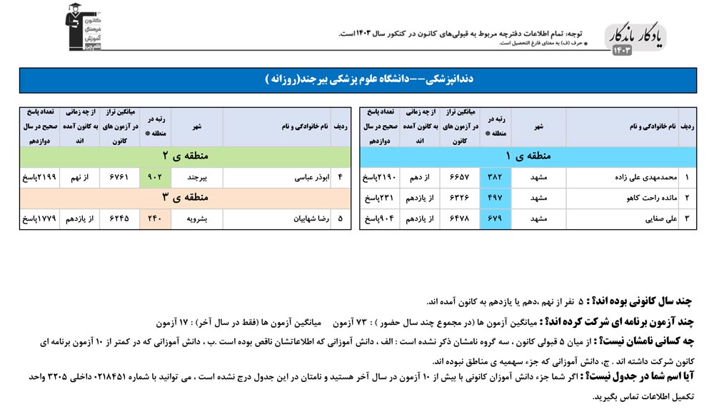 یادگار ماندگار : قبولی های کانونی دانشگاه علوم پزشکی بیرجند در همه رشته ها در سال 1403 را در ادامه مشاهده کنید.فایل با کیفیت قبولی های سال 1403 را در قسمت فایل های ضمیمه دانلود کنید.