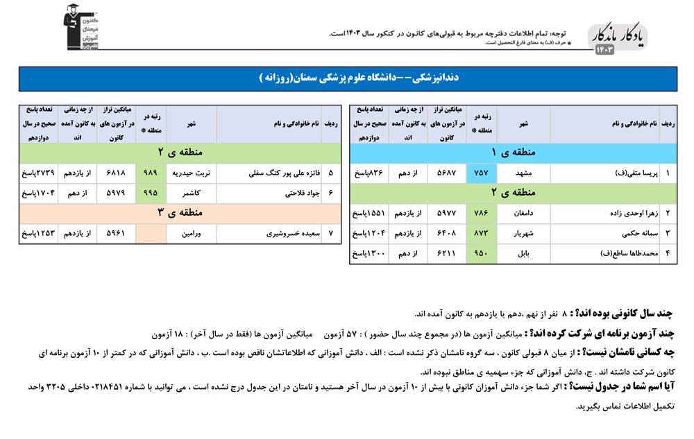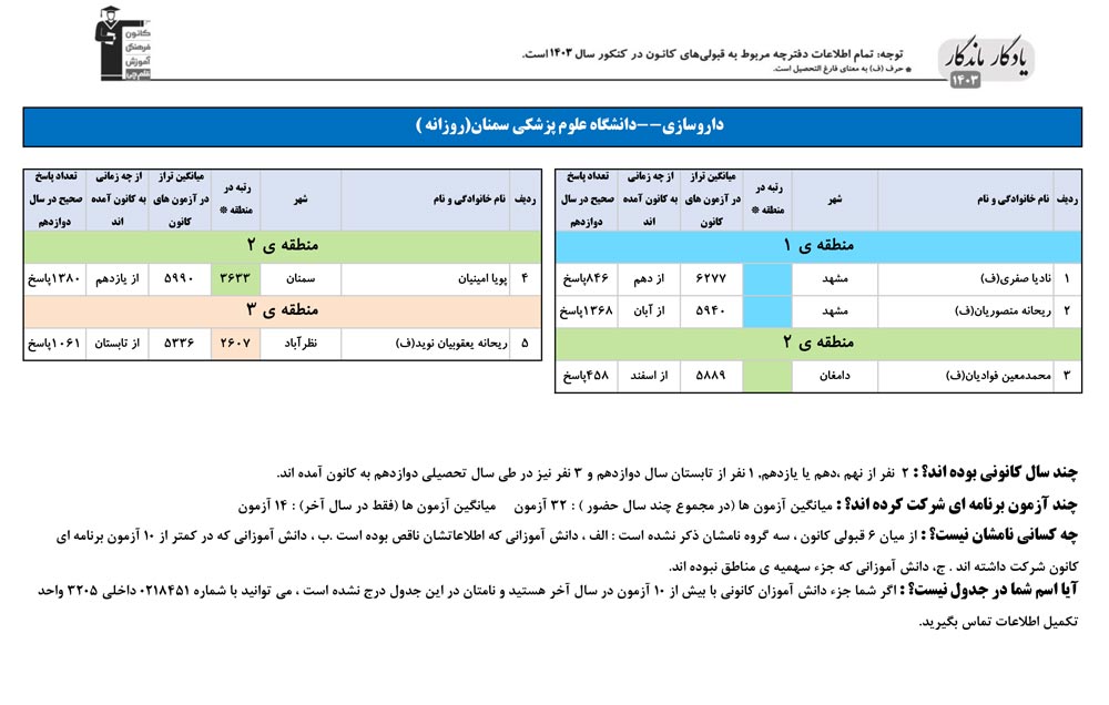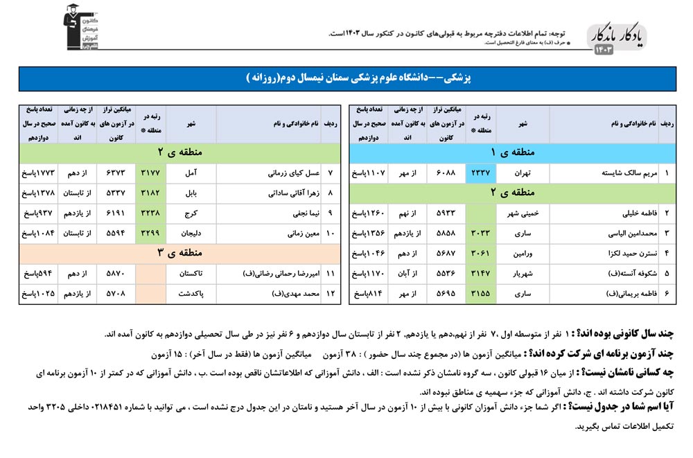 یادگار ماندگار : قبولی های کانونی دانشگاه علوم پزشکی سمنان در همه رشته ها در سال 1403 را در ادامه مشاهده کنید.فایل با کیفیت قبولی های سال 1403 را در قسمت فایل های ضمیمه دانلود کنید.