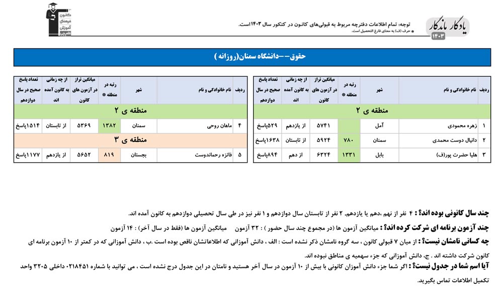 یادگار ماندگار : قبولی های کانونی دانشگاه سمنان در همه رشته ها در سال 1403 را در ادامه مشاهده کنید.فایل با کیفیت قبولی های سال 1403 را در قسمت فایل های ضمیمه دانلود کنید.