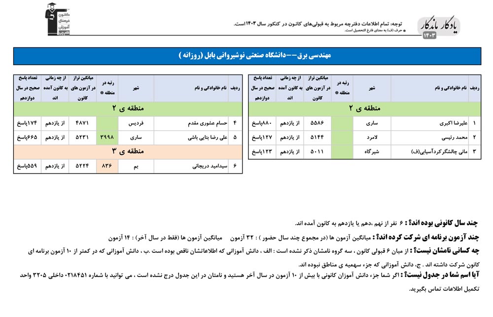 یادگار ماندگار : قبولی های کانونی دانشگاه صنعتي نوشيرواني بابل در همه رشته ها در سال 1403 را در ادامه مشاهده کنید.فایل با کیفیت قبولی های سال 1403 را در قسمت فایل های ضمیمه دانلود کنید.