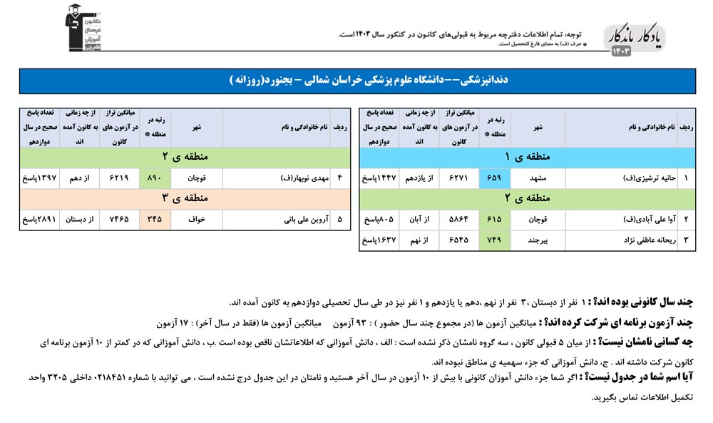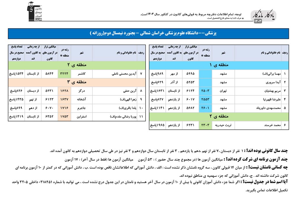 یادگار ماندگار : قبولی های کانونی دانشگاه علوم پزشکي خراسان شمالي - بجنورد در همه رشته ها در سال 1403 را در ادامه مشاهده کنید.فایل با کیفیت قبولی های سال 1403 را در قسمت فایل های ضمیمه دانلود کنید.