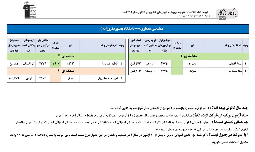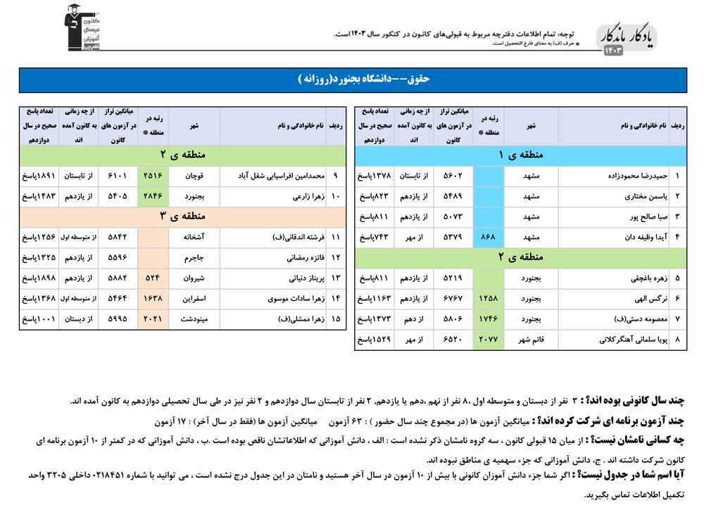 یادگار ماندگار : قبولی های کانونی دانشگاه بجنورد در همه رشته ها در سال 1403 را در ادامه مشاهده کنید.فایل با کیفیت قبولی های سال 1403 را در قسمت فایل های ضمیمه دانلود کنید.