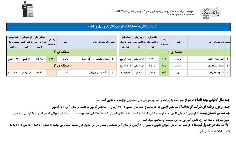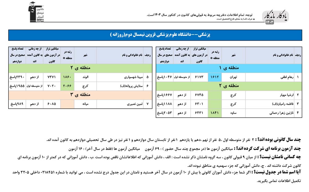یادگار ماندگار : قبولی های کانونی دانشگاه علوم پزشکي قزوين در همه رشته ها در سال 1403 را در ادامه مشاهده کنید.فایل با کیفیت قبولی های سال 1403 را در قسمت فایل های ضمیمه دانلود کنید.
