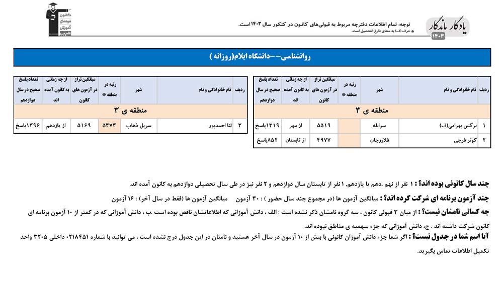 یادگار ماندگار : قبولی های کانونی دانشگاه ايلام در همه رشته ها در سال 1403 را در ادامه مشاهده کنید.فایل با کیفیت قبولی های سال 1403 را در قسمت فایل های ضمیمه دانلود کنید.