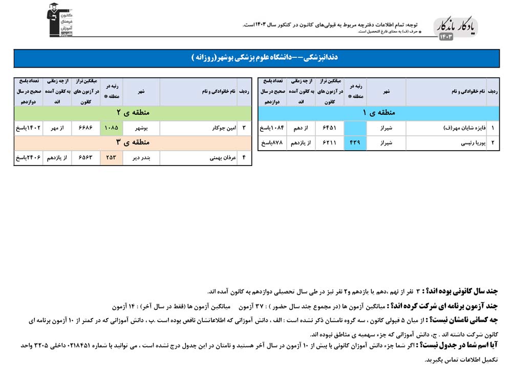یادگار ماندگار : قبولی های کانونی دانشگاه علوم پزشکی بوشهر در همه رشته ها در سال 1403 را در ادامه مشاهده کنید.فایل با کیفیت قبولی های سال 1403 را در قسمت فایل های ضمیمه دانلود کنید.