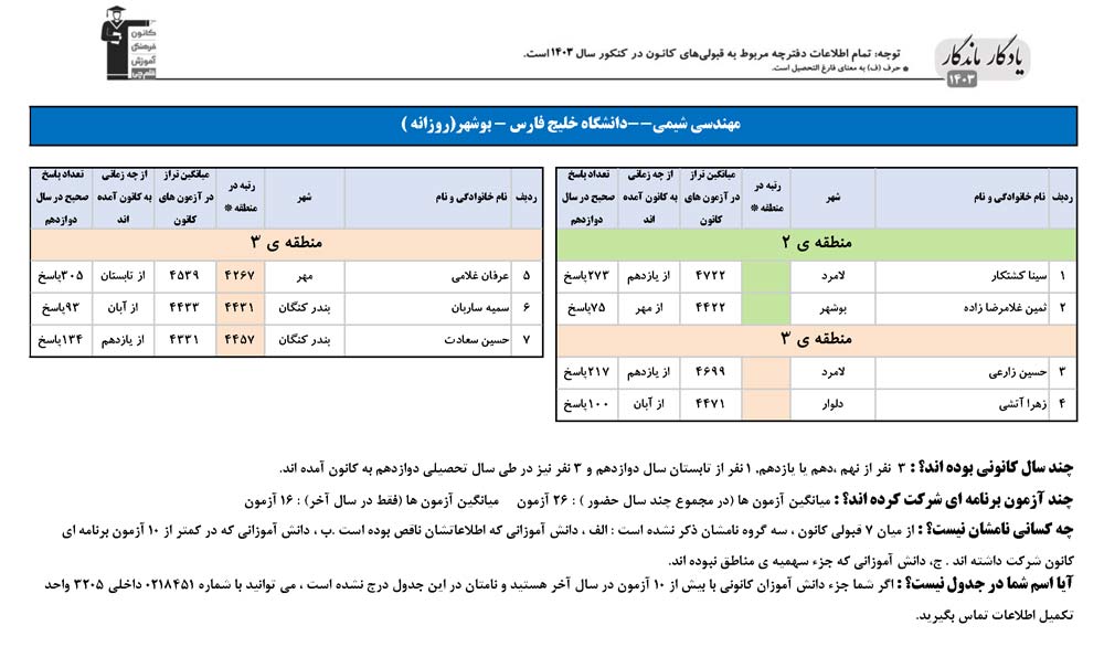 یادگار ماندگار : قبولی های کانونی دانشگاه خلیج فارس - بوشهر در همه رشته ها در سال 1403 را در ادامه مشاهده کنید.فایل با کیفیت قبولی های سال 1403 را در قسمت فایل های ضمیمه دانلود کنید.