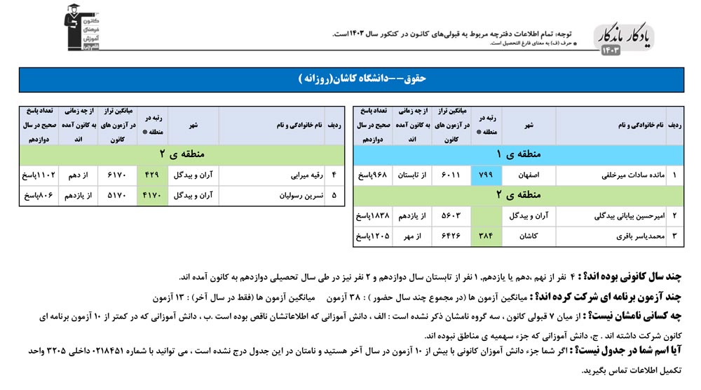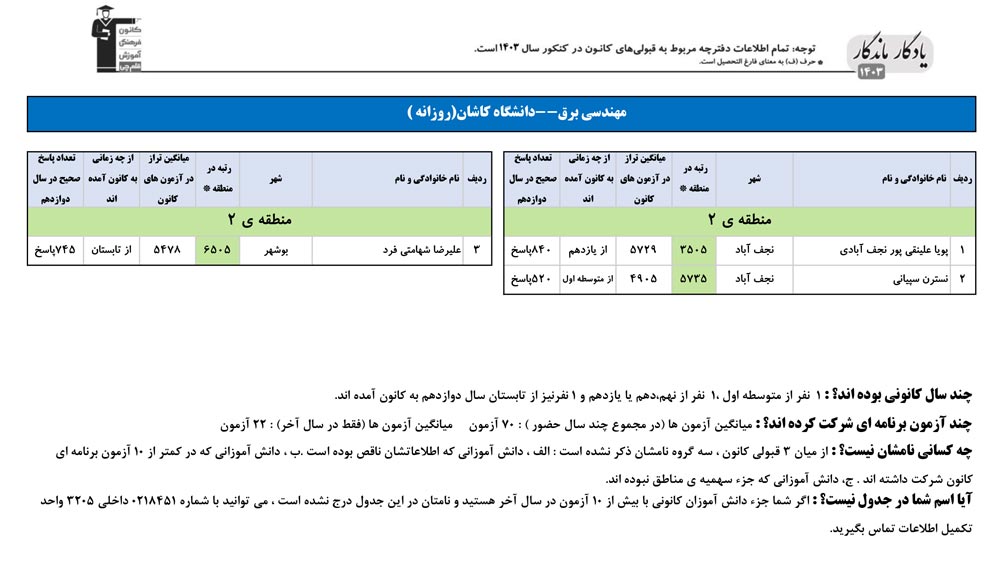 یادگار ماندگار : قبولی های کانونی دانشگاه کاشان در همه رشته ها در سال 1403 را در ادامه مشاهده کنید.فایل با کیفیت قبولی های سال 1403 را در قسمت فایل های ضمیمه دانلود کنید.
