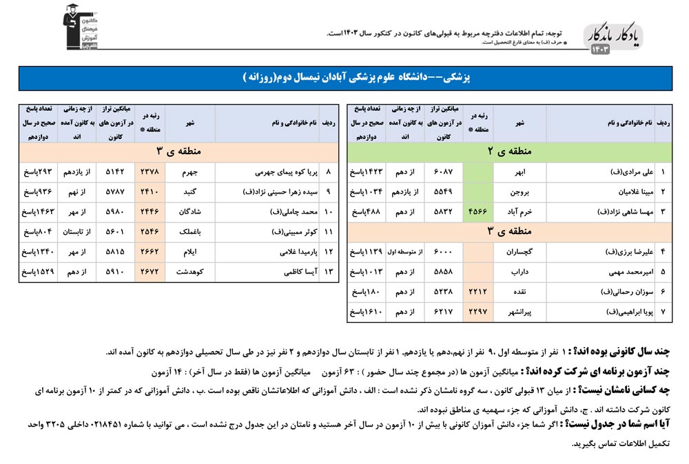 یادگار ماندگار : قبولی های کانونی دانشگاه علوم پزشکی آبادان در همه رشته ها در سال 1403 را در ادامه مشاهده کنید.فایل با کیفیت قبولی های سال 1403 را در قسمت فایل های ضمیمه دانلود کنید.